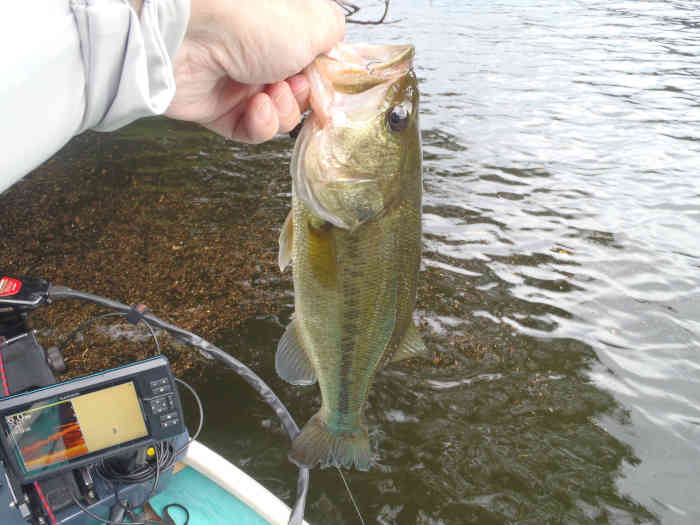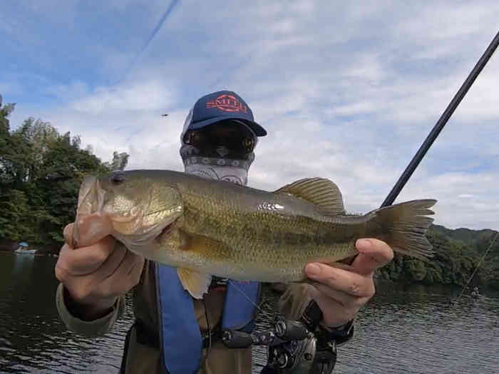 この日はとにかく岸際にバスの気配が感じられない日で、岩盤にノーシンカーワームを落としても、ウッドチップカバーを攻略しても全くバイトが得られなかった。勿論見える魚も皆無。となるとバスは少し深い位置に居るのだろうなと考えた。