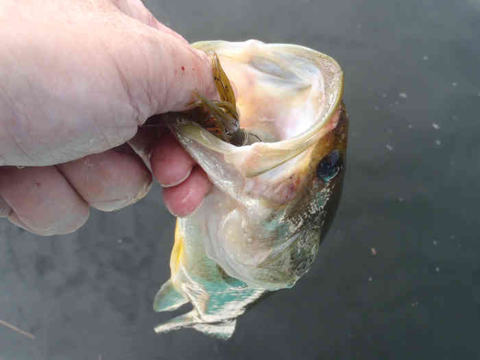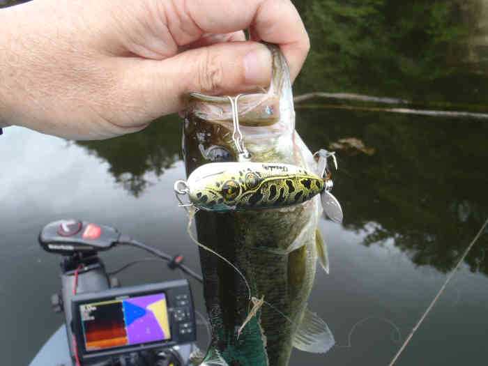 この時使ったベビートーピードは流木周りをスムーズに攻略できるようにダブルフック仕様に変えてある。 ダブルフックは直付されるケースが多いと思うが、直付だとフッキング率が悪かったり掛けた魚をバラす確率が上がると自分は感じているのでスプリットリング(オーバルリング)を介してダブルフックを装着している。 障害物の回避率はダブルフック直付に及ばないが、フッキング率の悪さや掛けた魚のバラしやすさに関しては若干改善出来ていると感じる。