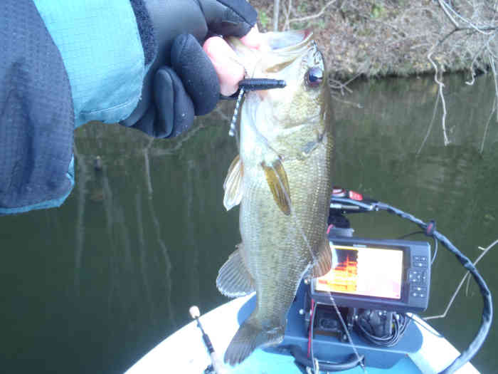 朝イチから魚探掛けを始め、昼頃には下流域の魚探掛けがおおよそ完了した。そこで午後からは気になる場所をダウンショットでチェックしてみることにした。この時期に良さそうなディープフラットは不思議とノーバイト。色々と探ってみると、岸寄りの緩やかなバンクの水深3~4mに点在する立ち木周りや小規模なフラットでバイトが出ることが分かった。