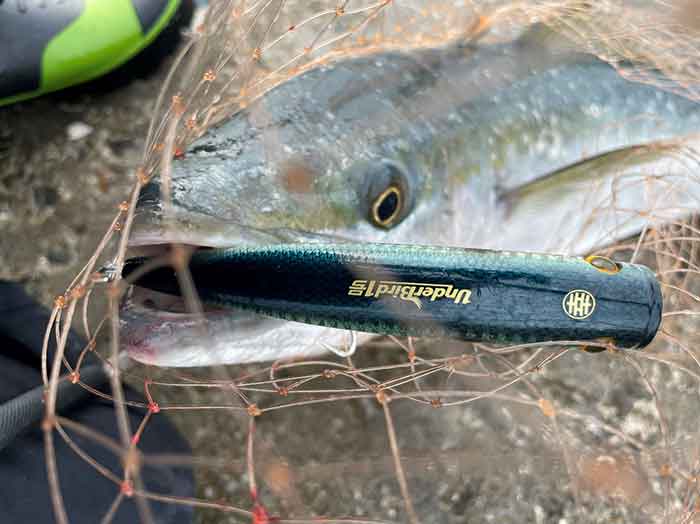 まだチャンスがありそうなので今度は使ったことのなかったアンダーバード1号を使用してみます。小口径のポッパーなので長めのストロークで誘ってみます。すると泡の中に隠したルアーがステイするタイミングでドバッと水面を割ってバイトです。手前に直ぐに寄りましたが元気いっぱいで暴れます。咥え方がバッチリだったので強気に止めて無事ゲットでした。