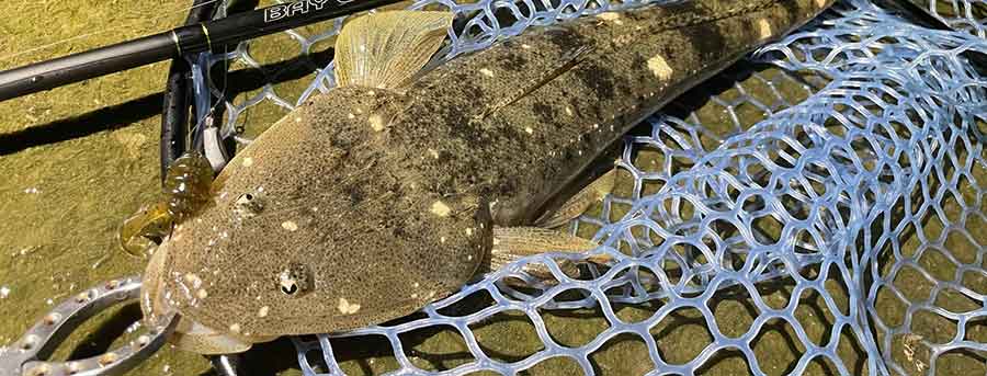 どうやらマゴチがバイトする条件が合っているようです。そのまま少しずつポイントをずらしながら釣り下がっていきます。流芯がどんどん足元に近づくような地形なのでキャストをどんどん短くしながらピンポイントで狙っていきます。リグをちょこんとリフトして、あとはコーヴァイチューが潮を受けて勝手にアピールしてくれる。このイメージでリフトアンドフォールを を繰り返しているとまたしてもボトムでゴンっとバイト!こちらもフッキング成功で同じような引き。ランディング時に魚が暴れて手こずりましたがまたしてもマゴチキャッチでした。