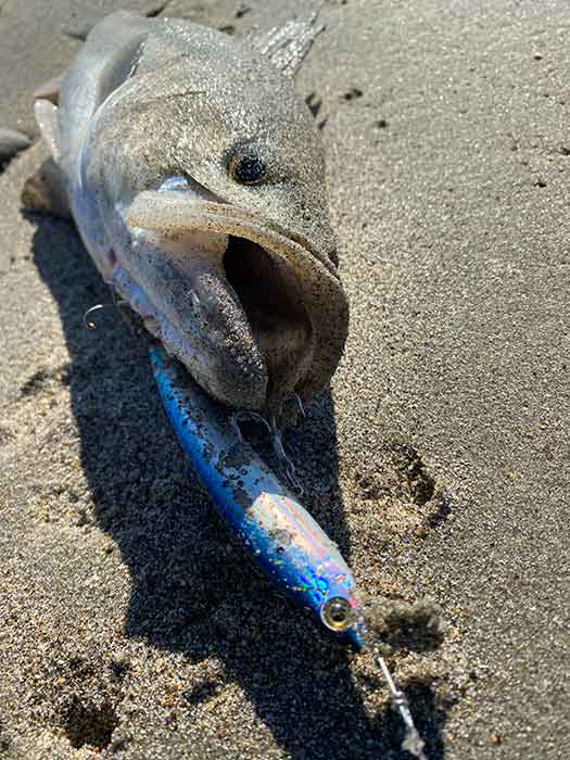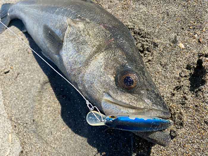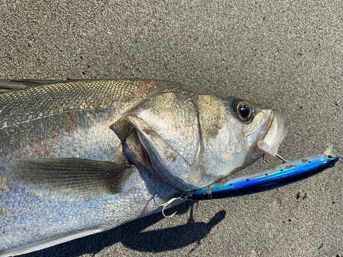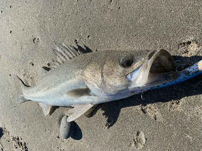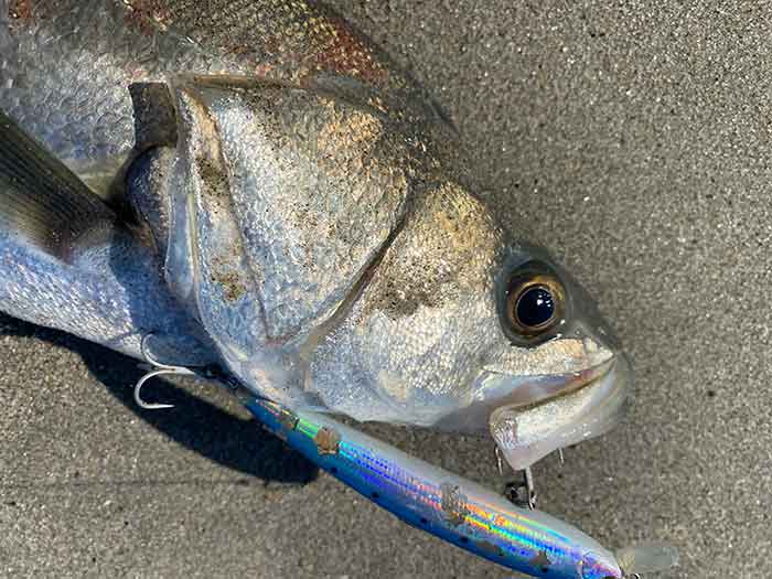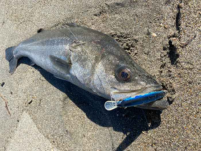 下げ潮でベイトが折り返すのを待ちながら、ペースダウンの釣りを続けていると、波打ち際で突然魚が喰ってきた。水面に頭を出しエラ洗いを始めたこの魚はまずまずの良型だった。足元で掛けたため魚との距離が近く、まだ弱っていないマダカとの至近距離のファイトはスリリングだった。