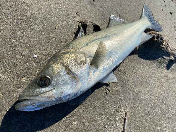 イワシカラーに変えた後は、波打ち際や沖での当たりは増えた。しかし活性があまり高くないのか?フッキングに至らない時間が続いた。潮の流れが緩み、マダカの活性が下がり始めたのだろう。その後緩んだ潮の中でなんとか岸際で同クラスの魚を追加した。