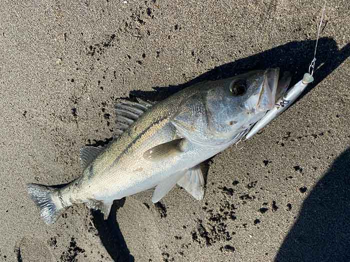 東に向かうベイトの群れを追いながらサラナを打ち込み、沖から波打ち際まで丁寧に引いてくると、最初のあたりの手前のブレクで捕えた。ゆっくりとロッドで掛かり具合を確かめながらフッキングし、そのまま岸に寄せていく。大きな抵抗もなく上がってきたのは45cmの中型のマダカであった。