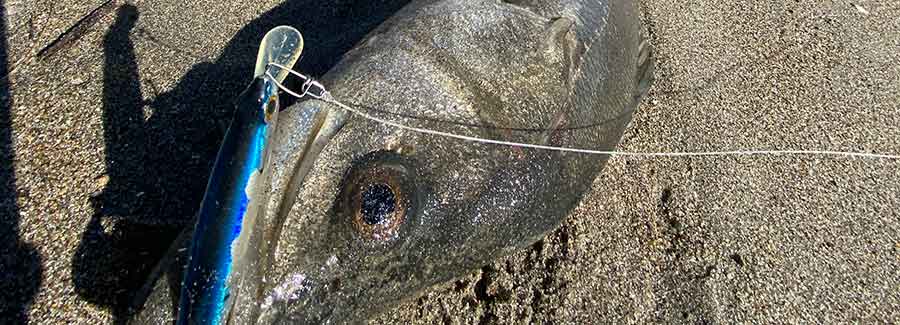 波打ち際で暴れる魚をロッドワークでコントロールし、一旦沖に走らせ落ち着かせた。次に打ち寄せる波にタイミングを合わせて頭を岸に向かせて、そのまま一気にランディングに持ち込んだ。