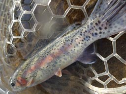 放流タイムの連続ヒットの時間が過ぎると、嘘のように静まり、忍耐の時間です。こんな時はクランクで・・・・カミオンを結びキャストをすると、ゴツ!と大きなあたりが・・・・そしてドラグが鳴り、じっと耐えるしかありませんでしたが、周囲にも人がいて忍耐にも限界が・・・・結局、ラインブレイク(リーダーのブレイク)でした。