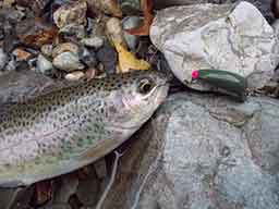準備を済ますと、少しでも早く釣りを始めたい私は、ガードレールに結び付けられたロープをたよりに、足元に細心の注意を払いながら入渓。ちょうど小さな落ち込みからの流れが連続しており、一つ一つの流れの幅はさほどないため、クロスキャストには無理があります。そして浅めの水深を考慮し、選んだのはmkスプーンTRAP2.2g赤金。これを流れの筋沿いにアップキャストで探ってみると、2投目にヒットしたがすぐにオートリリース。次があると気を取り直して、同じようにアップキャストで探ってみるものの、ヒットしても全てオートリリース。さすがに焦ってきましたが、冷静に考えてみると魚の活性が低い事が考えられます。定位しているニジマスも、流れてきたルアーをガッツリ咥えるほど活性は高くないのでしょう。