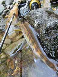 渇水気味の水量には4gのD−Sラインはピッタリで、スローな泳ぎに追ってくるヤマメが多く見えました。