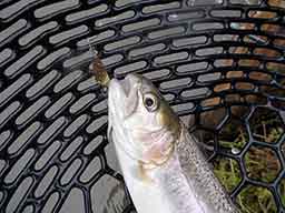その後2匹ほど同様にヒットさせた後、反応がなくなってきたので、ルアーもスティルエリアチューンにチェンジ。タックルもパニッシュの時はアクションコントロールを重視して、IBXXー56MT(ナイロン2.5lbライン)を使っていましたが、スティルエリアチューンでは飛距離を稼ぎたいので、エリア用ロッド(FLDB−56L)+ナイロン2lbにチェンジ。このタックルでスティルエリアチューンをフルキャスト後、ストップ・アンド・ゴーやジャーキングで探ってみますが反応がありません。そこでパニッシュエリアの時と同様にノーアクションのスローリトリーブで探ってみます。するとピックアップ前に底に潜るようにして土煙が上がってスティルエリアチューンに、追ってきたニジマスが猛然とアタックして見事にヒット。どうも活性の高い魚はボトムを意識しているようです。それに気づいてからはスティルエリアチューンがなるべく底をするようにリトリーブさせてみると、続々とニジマスのヒットが続きます。カラーローテーションしながら同様の方法で釣果を伸ばした後は、スプーンでのボトム攻略に取り掛かります。