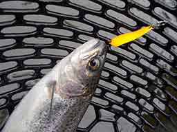 この釣り場の営業時間は午前8時半からのですが、8時過ぎに到着したところ、すぐに受付をしていただけて、釣りもすぐに始めて良いとのこと。管理釣り場は受付から500mほど下流側にあるため、そちらには車で移動します。この日の天候は雨で強風とはいかないまでも風も吹いており、人間のコンディション的には結構辛いものがあります。(そのかわり人が少なく、のんびりできました。)そんな中で下流側の池の左岸で実釣を開始します。