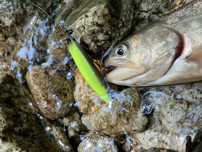 ポイントの上流に着水させてから送り込んでリトリーブを開始し、トゥイッチをしてヒットさせる。
