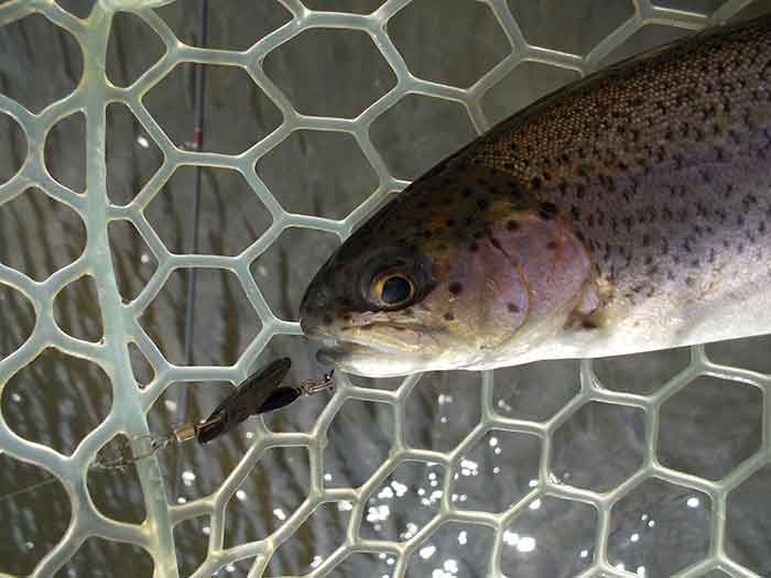 そこでスプーンに戻して、アンバー0.8gをチョイス。放流から時間がたっていたので、ナチュラルカラーを選択。これをカウント2ほど沈めて、ややスローなリトリーブで探ってみたところ、途切れかけていたヒットは復活しました。この方法での反応が落ち着いたところで、早めの昼休憩としました。