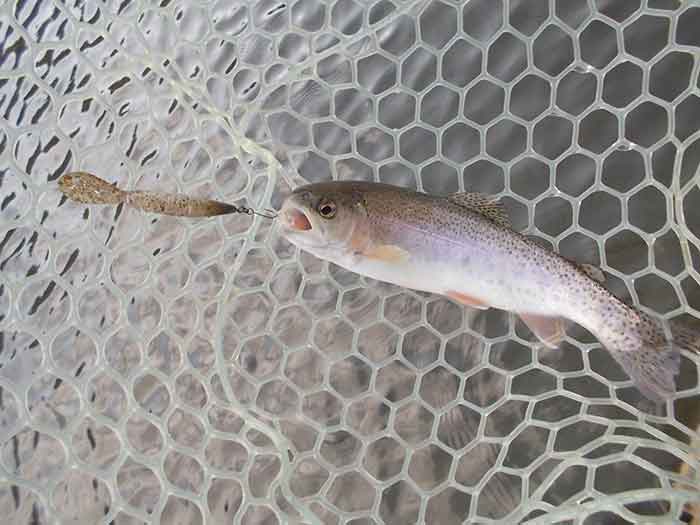 続いてスティルエリアT2にルアーチェンジします。マジックジャークで探ってみるのですが、水深が極端に浅いため潜り過ぎないように、ショートピッチのマジックジャークで探ってみたところ、これも正解でニジマスのヒットが続きます。
