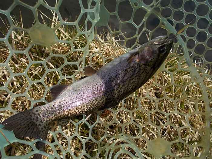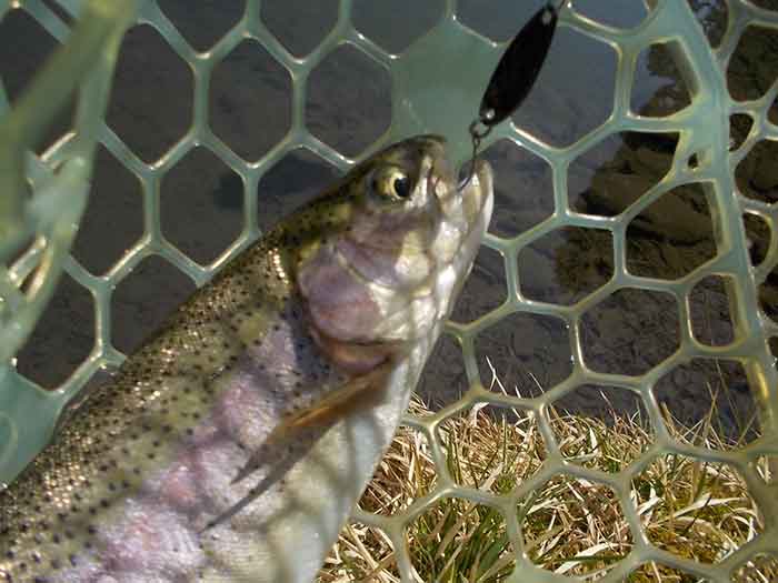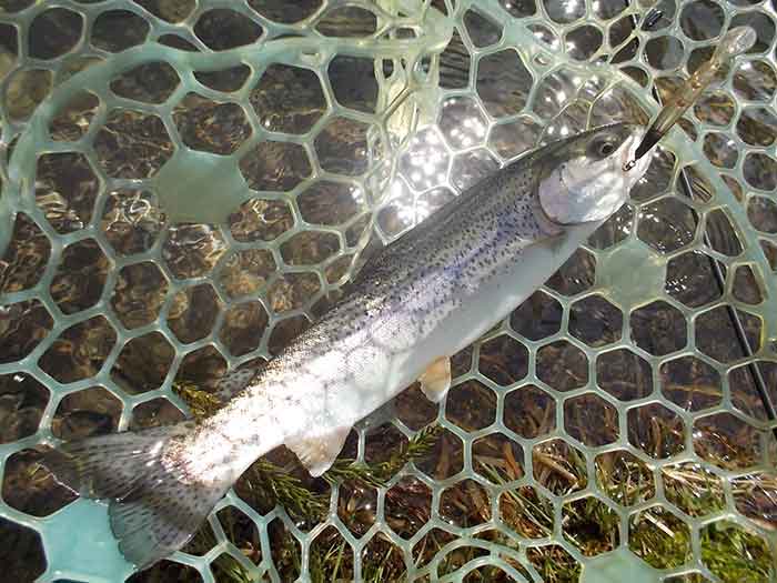 一匹目がキャッチできたところで、放流が行われました。場所は対岸ですので、遠投が必要です。ルアーをドロップダイヤ3gスプーンにチェンジ。カラーは放流魚に対してのアピールを意識して、アカキンを選択。これをフルキャストしたらロッドを立てて、表層をファストリトリーブしてみます。すると二投目に狙い通りヒット。ポンド中心部の沈み岩に注意しながら、そのファイトを楽しんでネットインしたのは、レギュラーサイズのニジマスでした。