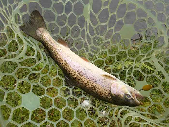 その付近はポンドの中でも水深がもっともあるので、ニジマスたちは沈んだと予想し、スプーンを沈めたりクランクを試したのですが、魚信を得ることができず、再び場所を変えることにしました。