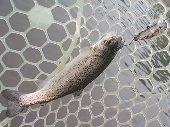 まずは1.1gスプーンのアピールカラーからスタートし、状況を探っていきます。スプーンをカラーローテーションしながら、各レンジを探ってみるのですが、明確な魚信が得られず時間だけが過ぎていきます。試しにトップウォータープラグで表層を、ボトム用プラグでボトム付近をそれぞれ探ってみても反応なし。もしかするとルアーの横の動きに魚がスレているのではと考え、スティルエリアシリーズのマジックジャークを試してみます。するとスティルエリア48HFに、この日の一匹目がヒット。ただタックルを伝わってきた魚信は、良型のものではありません。ドラグもなることなくネットインしたのは、25cmクラスのニジマスでした。