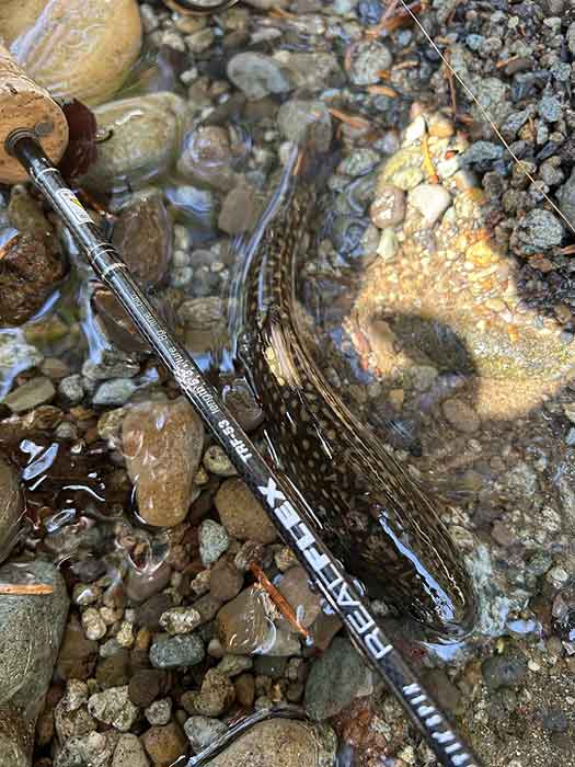 次のポイントでも、ボトムからのスローなヒラ打ちをさせていると、イワナの連続ヒットでした。