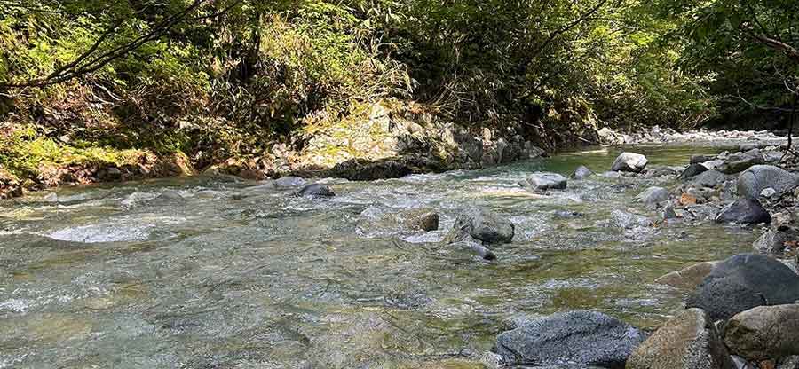 水量も多く不安でしたが、入渓して数投目で岩魚のヒットで不安は解消しました。
