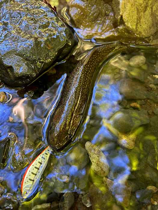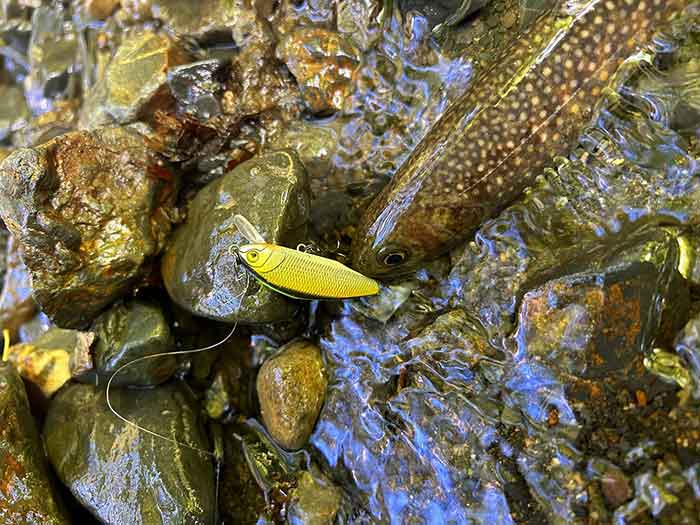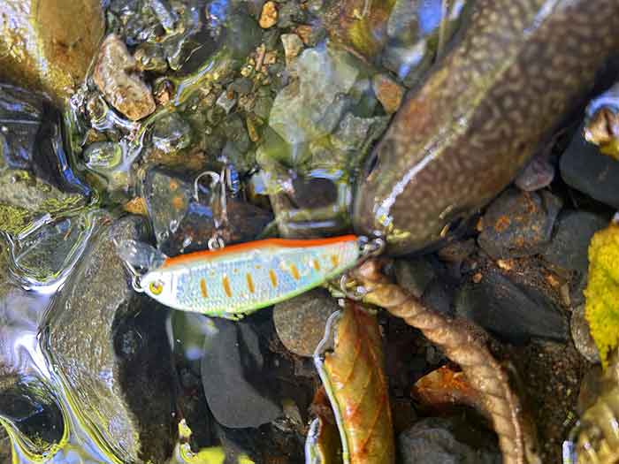また、限られたポイントでしっかりとヒラ打ちするので岩陰にいる岩魚がルアーを追います。