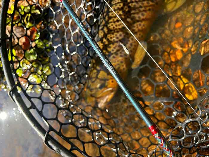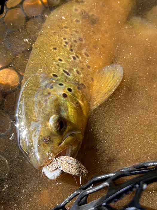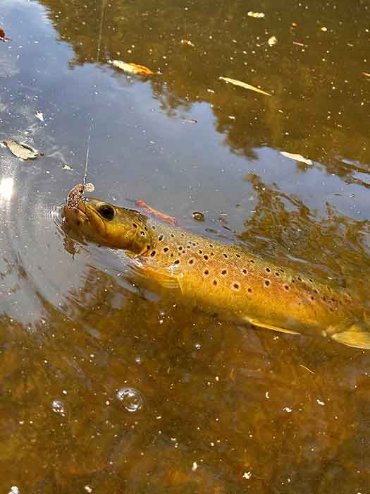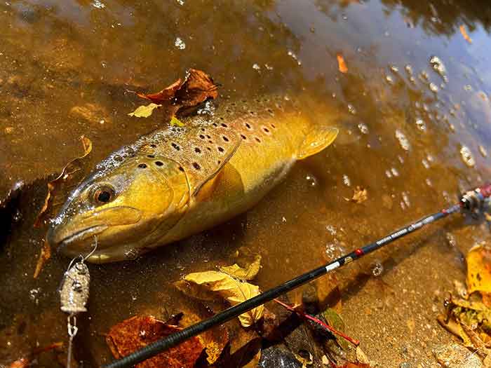 ヒットしたのは、茶マスとも言われるブラウントラウトで、今回の釣行で3種類目のトラウトに驚きました。