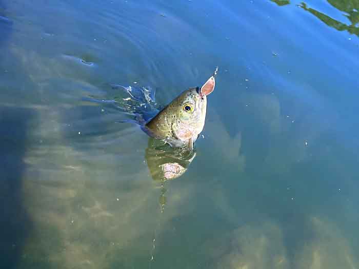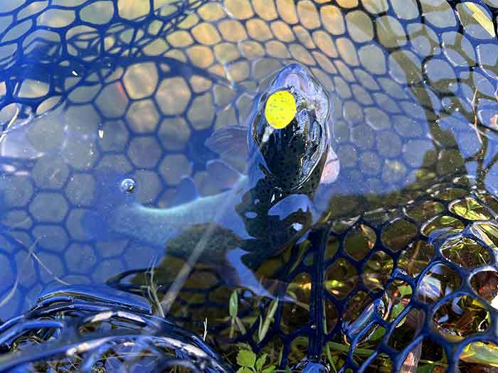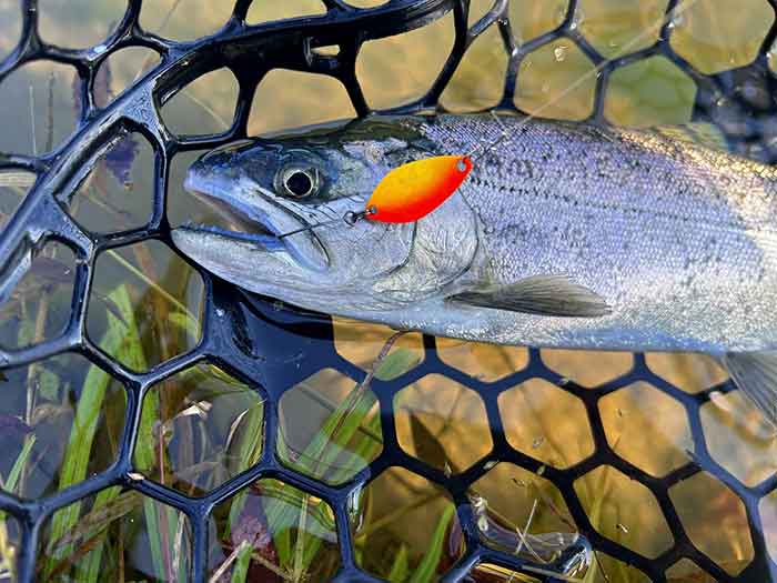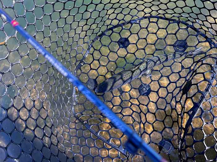 アンバーのカラーを換えながら、表層狙いを続け、レンジをキープしながらリトリーブをしていると、小型ですが元気なトラウトのヒットが続きました。
