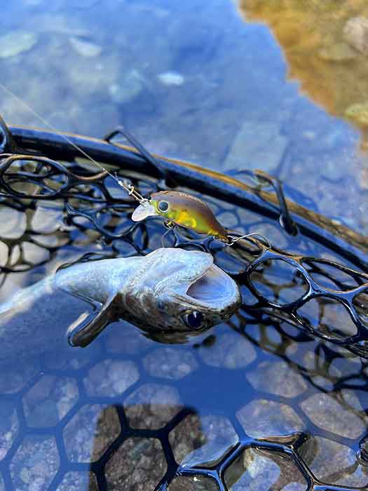 また、31mmのサイズが、虫などが水面に落ち波紋がたつようなイメージで、キャスト・着水・ポーズでもヒットがあるので、ラインスラックに注意して集中します。