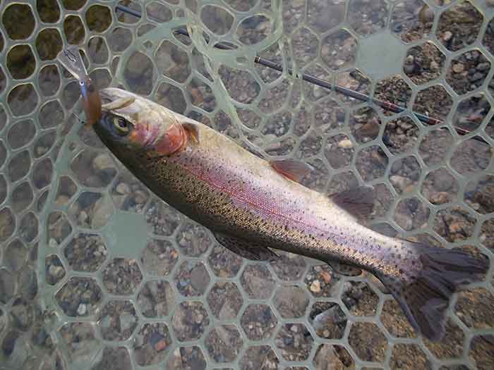 続けて水中を観察していると、川の流れと垂直に駆け上がりになっているところに、魚たちが定位しているのを見つけました。そこでダンゴウオDR-Lowを、駆け上がりの少し上流側からクロスにキャスト。ドリフトさせながら、駆け上がり付近でU字ターンするようにリトリーブしたところ、これが最後のヒットパターンで、続々とニジマスのヒットは続きました。
