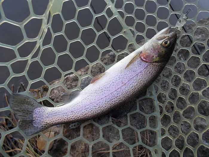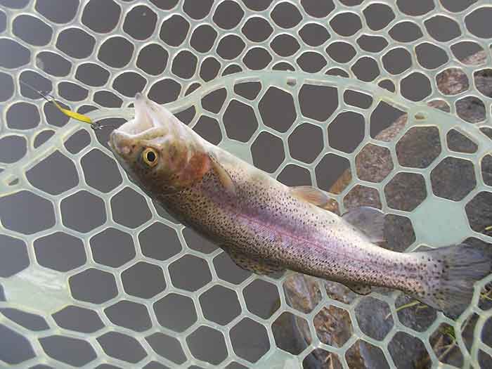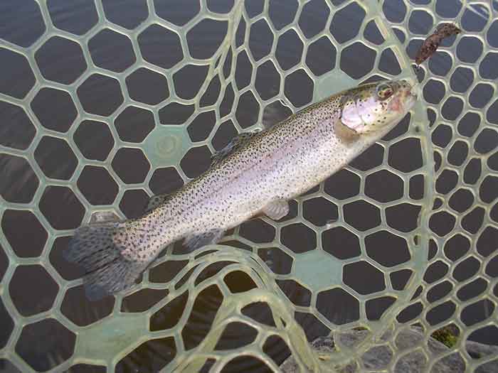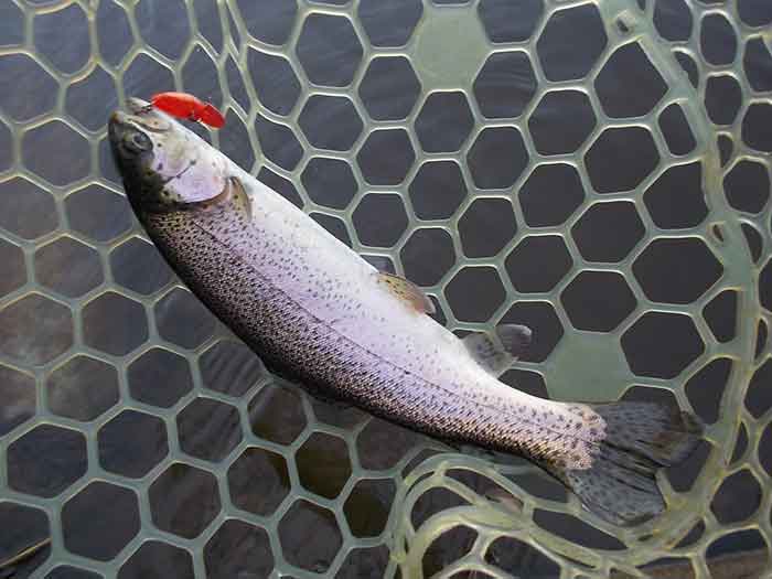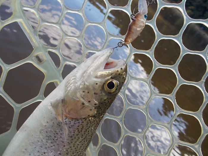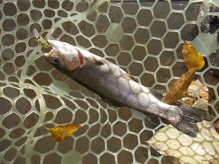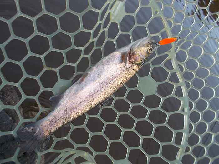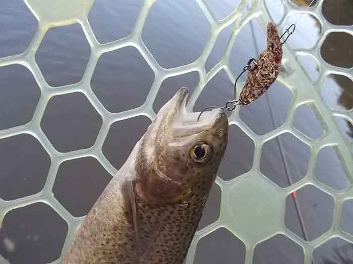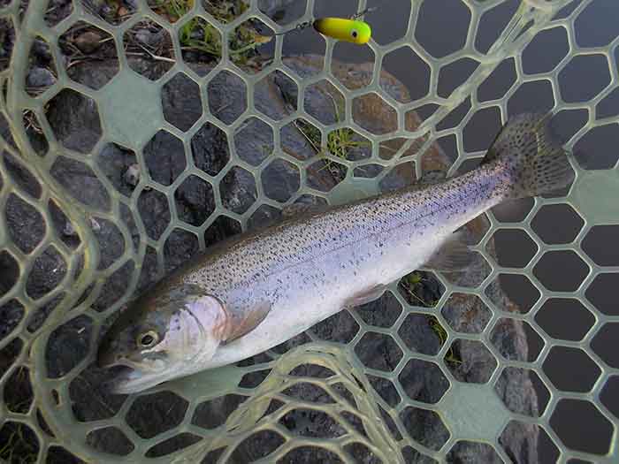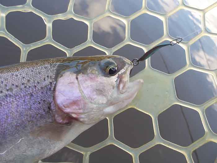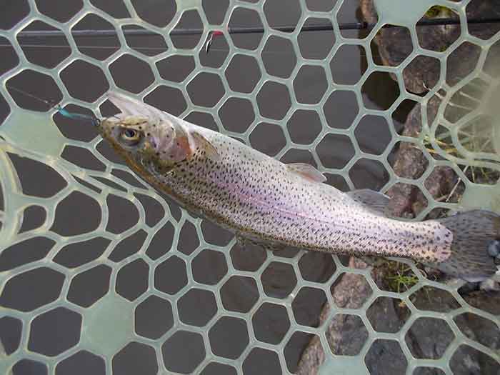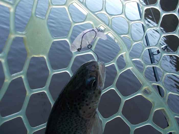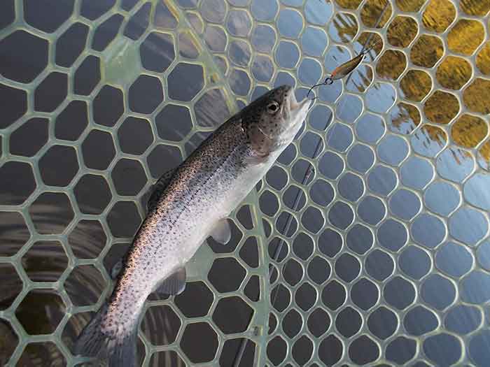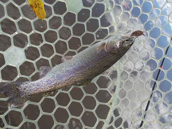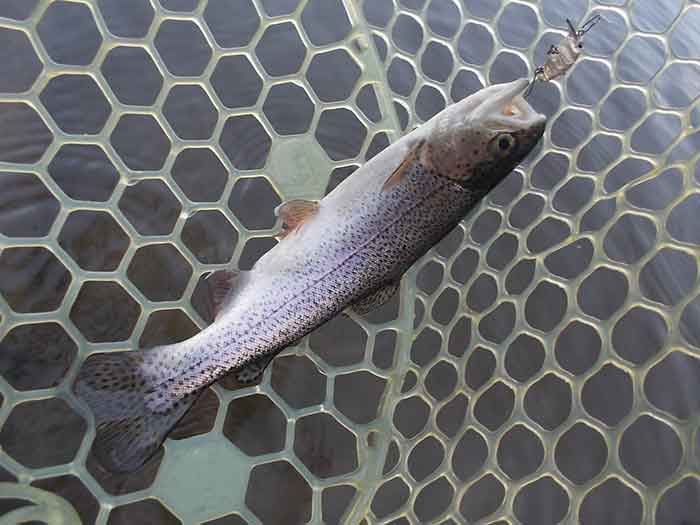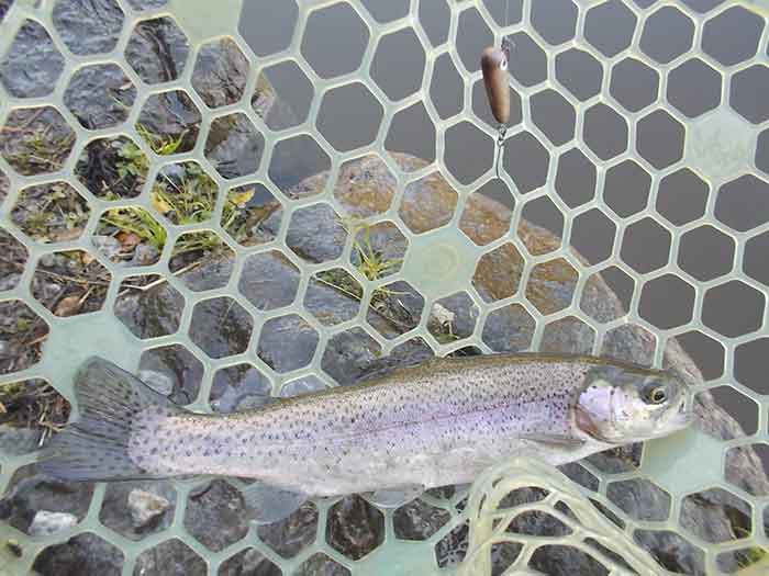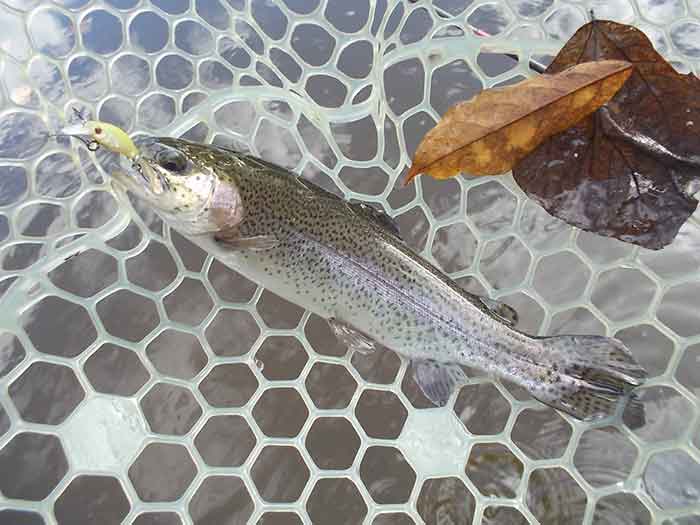 そこでここからはダンゴウオでレンジを探っていきます。最初はダンゴウオSR-Highからスタートします。キャストしたら後は超デッドスローで引いてくるだけです。すると一投目からレギュラーサイズのニジマスがヒット。どうもこの付近のニジマスたちは、かなり上のレンジに居るようです。