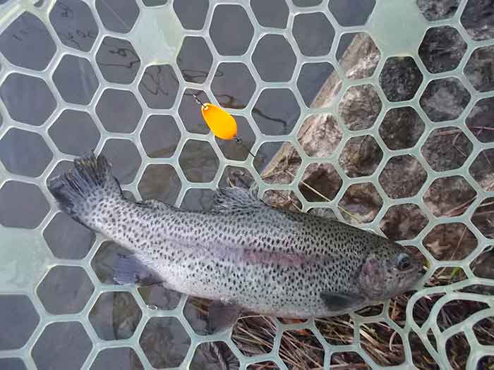 放流用タックルに、ルアーはドロップダイヤ1.8gスプーンのゴールドORを選択。表層をやや早めのリトリーブで探ってみたところ、数投目に放流魚がヒット。ただ次の一匹がヒットしません。なんとかエッセンシャル1.6gスプーンでも一匹はキャッチできたのですが、その後はしばらく何をやってもヒットしなくなってしまいました。なんとかアンバー0.8gスプーンでボトム付近を探って一匹のヒットがあっただけです。