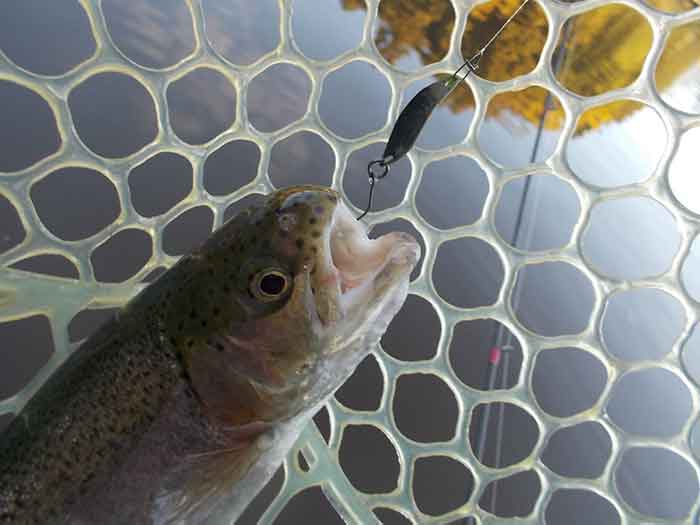 さて最初はエッセンシャル1.6gスプーンで、表層からレンジを刻みながら探ってみたところ、カウントダウン5でボトムまで沈めてからの巻き上げに、アタリがあります。ただ魚信はあるのですが、なかなかヒットしそうにありません。そこでアンバー1.1gスプーンの明滅カラーにルアーチェンジ。ボトム付近を探ってみます。ただそれまでの印象では、魚はボトムに張りついているというより、ボトムちょい上に沈んでいるといった感じです。そのため、着底後はロッドでワンフリップ入れてアンバー1.1gスプーンを少し浮かしてからリトリーブしてみます。自分のイメージでは、ボトムの少し上をリトリーブしているイメージです。最初のヒットパターンがこれで、明滅カラーからナチュラルカラーにローテーションしながら、1時間ほどはコンスタンスにレギュラーサイズのニジマスの釣果をあげることができました。
