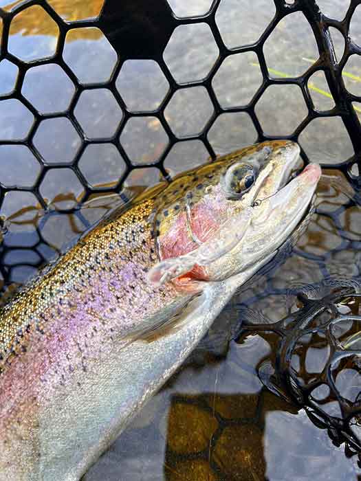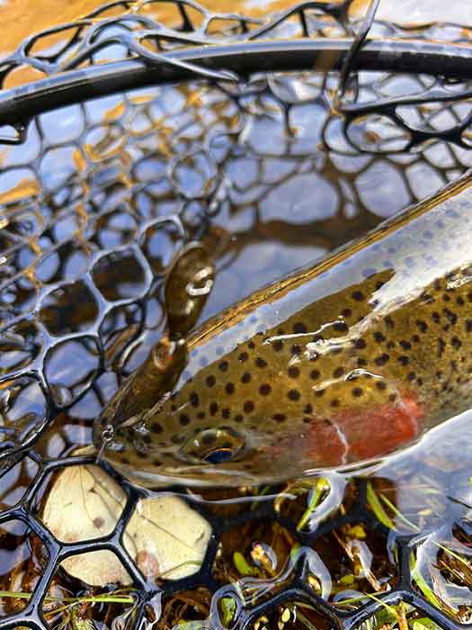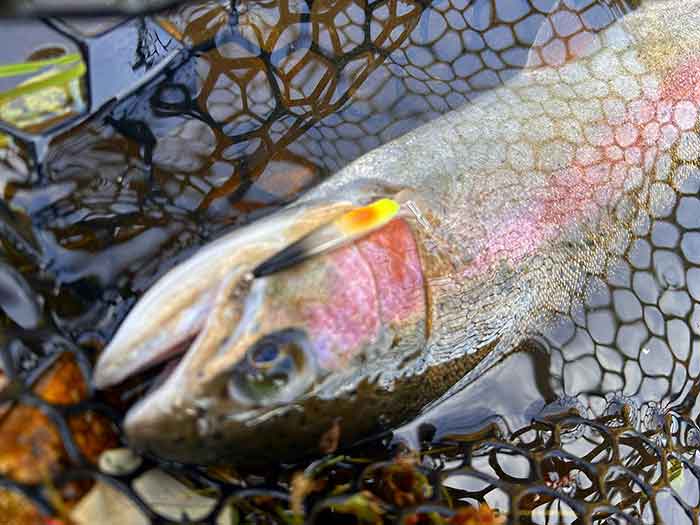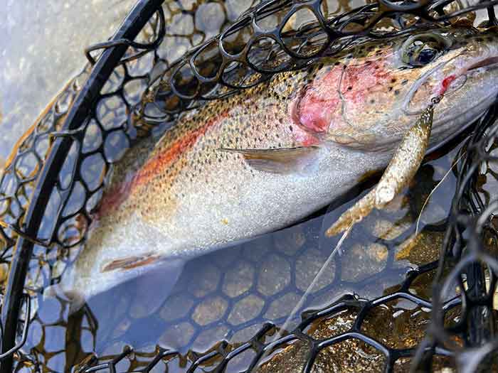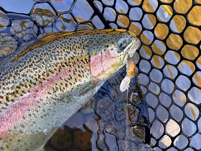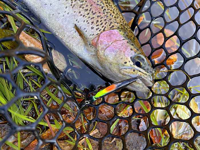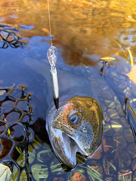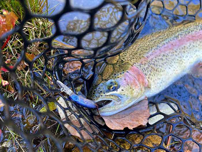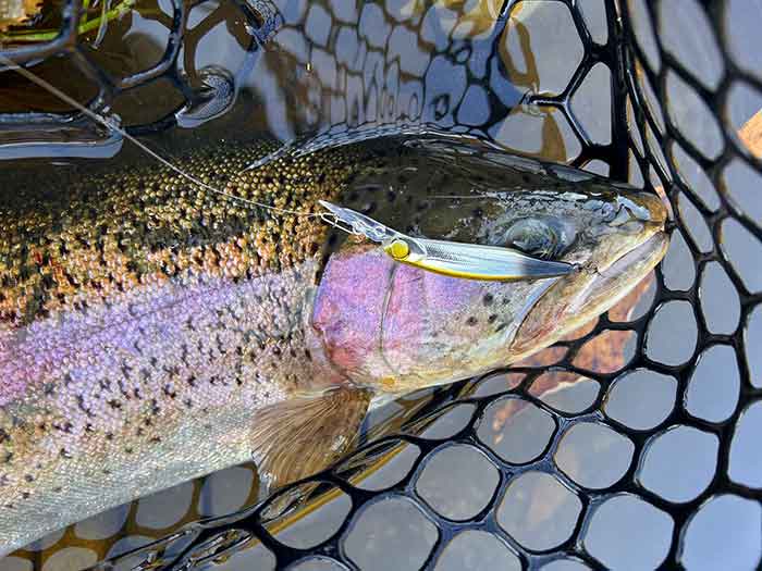 速く巻いたりジャークしたり、トラウトのヒットなどで、アイを微妙に調整することで、ルアーが左右に逃げないよう調整する楽しさもあります。