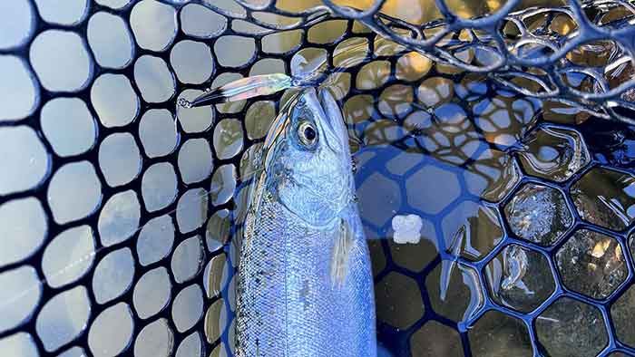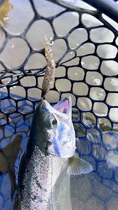 何度か同様に攻めていると、ルアーを追う魚影も数回あって、岸際でファーストヒットすることが出来ました。