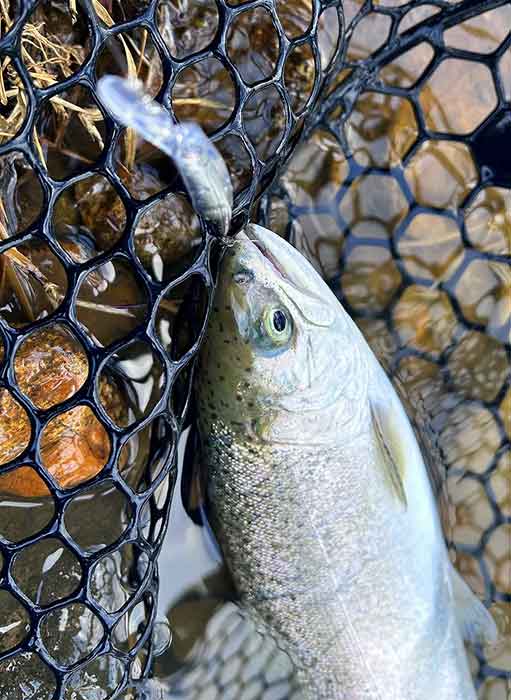 この寒さですので、トラウトの動きも鈍いので、スローな泳ぎやゆっくりと浮かぶ瞬間だったり、ベイトなどを岸際まで追い込んで・・・・・と、イメージをして始めました。