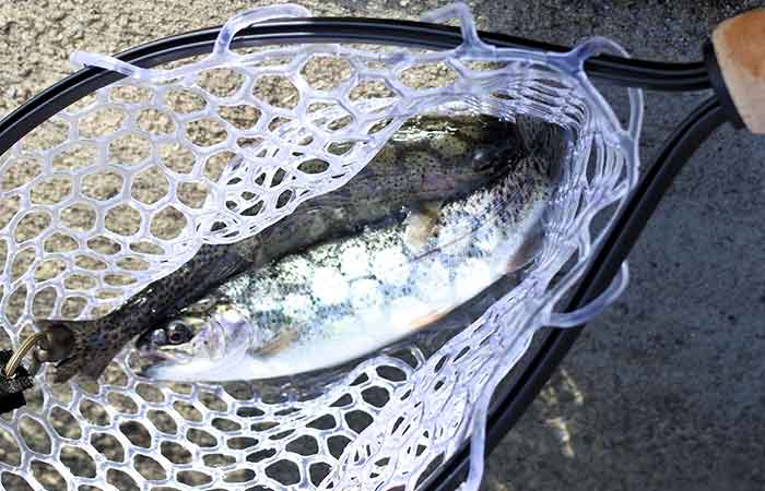 なんと、ペレット(粒状の魚の餌)撒きで、瞬間的に魚の活性を上げてもらうなんていう、サービスにもほどがあるほどのサービスに、青目のダンゴウオSR-Low まで借していただいたまさにスペシャルサービスに、生き返った、生気を取り戻した、そして降って沸いたチャンスに、泣きの三投で2尾のニジマスを釣った。いや、インチキ気味に釣らせてもらった。
