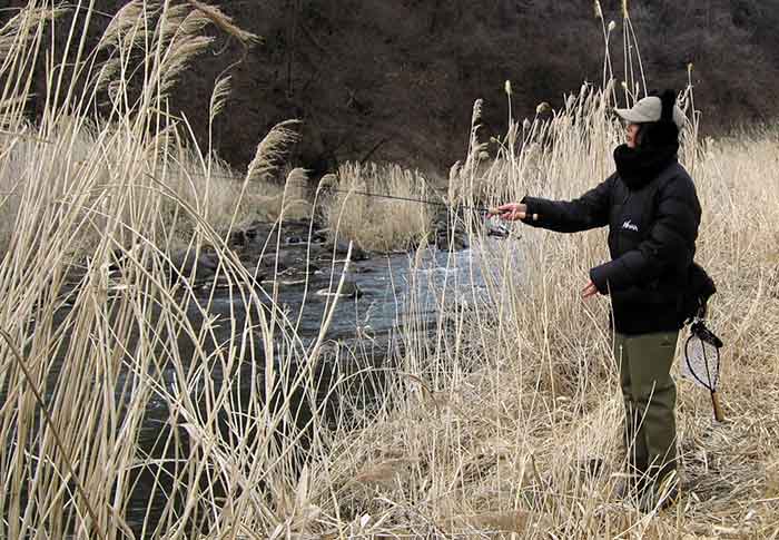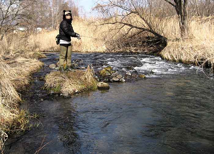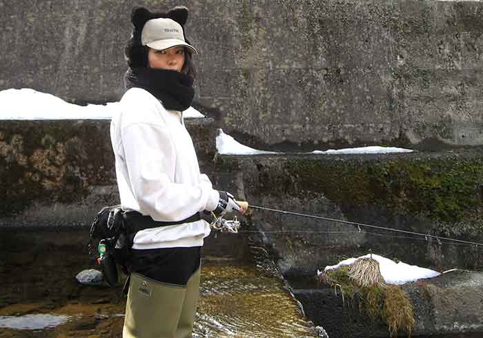 いよいよ彼女”ちゃんかな”も自然渓流デビューにこぎ着けた。思えば、利き手でのロッド握り、逆手でのリールハンドル回し、キャスト時ラインの出すぎを抑える人差し指でスプールをタッチするフェザリング、縦のジギング、横のジギングはラインフリーによるバックアンドフォース、はたまたロッドワークとただ巻き。疾(はや)きこと風の如しスピードで課題をクリアしてきた。最初は大雑把にキャストすること、静かに近づくは林の如く用水路でルアーの細かい動きを体感させる。攻める時は火のような、時には強烈なジャークとトゥイッチングを、そしてつまらないことには動じない焦らないことは、山の如くどっしりとした構えを教えてきた。それでも本当に魚が釣れるかどうかという最大にして最高に難しい目標も、3度目の練習会で管理釣り場のオーナーの大々サービスによって、これもまあクリア。