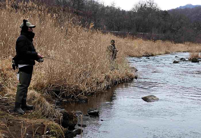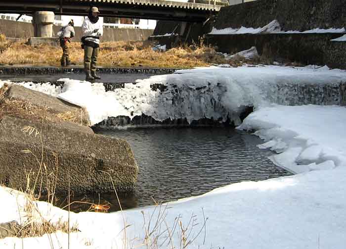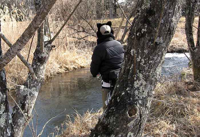 そして待ちに待った渓流解禁、まずは長野県佐久漁協管内ならば群馬県のお隣なので近い。軽井沢で待ち合わせをする。待ち合わせ場所は川のほとりなので、目の前に竿を出すといきなりかなり良型のヤマメがヒットしたものの、例年の半分ほどと減水した流れ、氷点下5℃の気温、前日の温かさに雪代(ゆきしろ)も混ざる3℃と凍る寸前の低水温下という悪条件にバラしてしまった。解禁日だというのに釣り人も少なく、悪い予感はこの後も続き、朝一のバラシ(釣り損なう)は、大苦戦の幕開けとなってしまった。