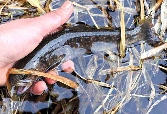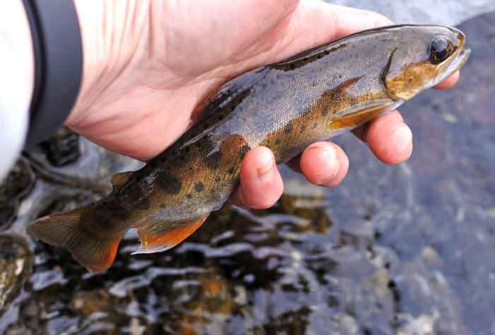 そしてこの日最大の出来事が起きた。バック&フォース4gでテンポをやや早めに変えたジギングに、ちゃんかな人生最初の渓流の魚がヒット。最初のイワナの餌になってしまうのではと思えるほど可愛い魚だが、パーマーク(幼魚斑)もくっきり。遊漁規則ぎりぎりの15cmは正真正銘のヤマメだった。