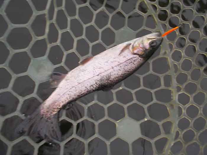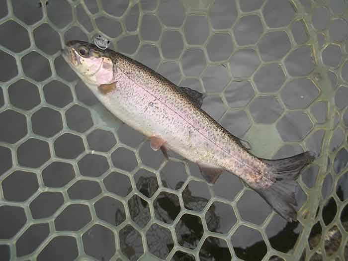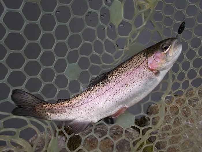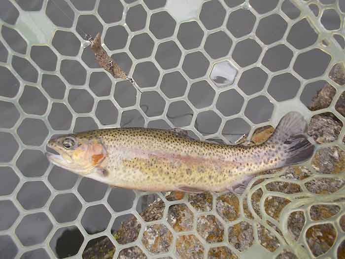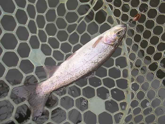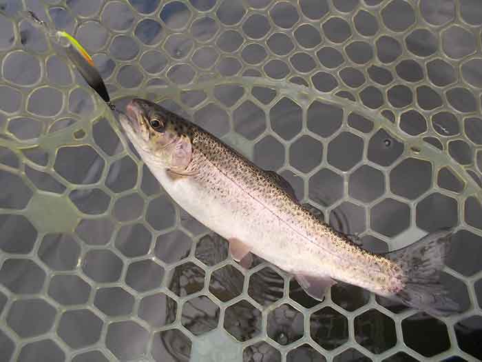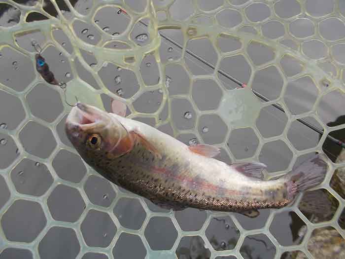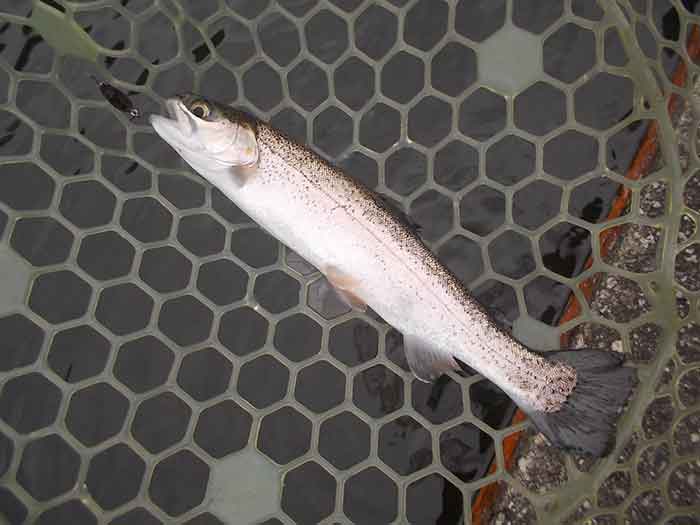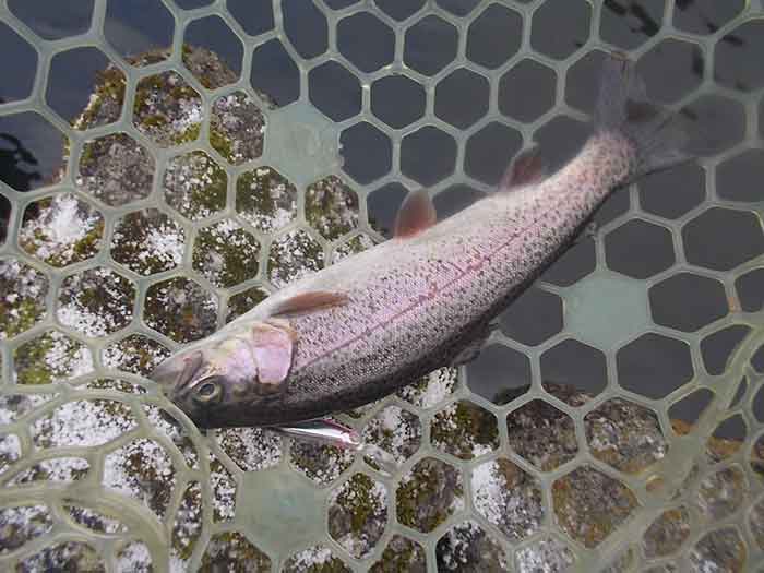 ただ、この後困った現象に見舞われました。と言うのも二投目以降、ほぼ100%の確率で、ボトムに沈殿した枯葉や藻がルアーやフックに絡みついてきます。ロッドを伝わってくる感覚でわかるため、絡んだものを取ろうとロッドをあおってはみるのですが、なかなかうまくいきません。ただ一投目でのヒットがあったため、そのままカラーローテーションしながら、ちっちゃなズルビーを使い続けます。すると着底から比較的早いタイミングで、早めのリトリーブにレギュラーサーズのニジマスがヒットします。逆に着底後しばらくヒットがないと、沈殿物が絡まって、ヒットが望めそうにない状況でした。それさえなければ、高い確率でヒットが続きそうです。