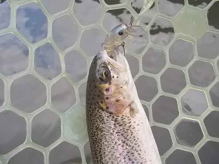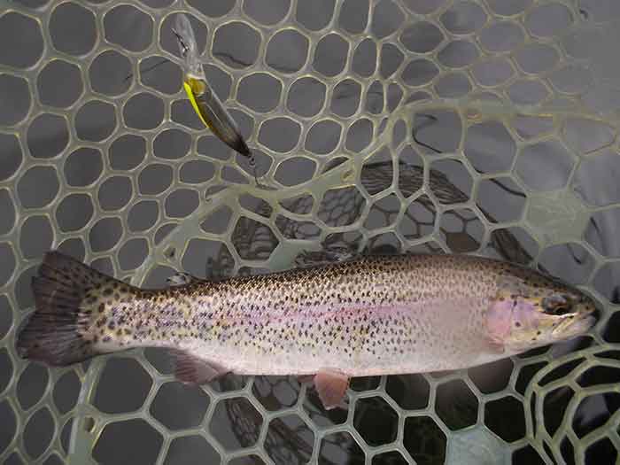 選んだのはスティルエリアT2です。キャストしたら一気に深く潜らせた後、マジックジャークを試してみます。タイミングを色々変えながら、見える距離では魚の反応を見ながら、スティルエリアT2を操作することで、レギュラーサイズのニジマスがヒットします。