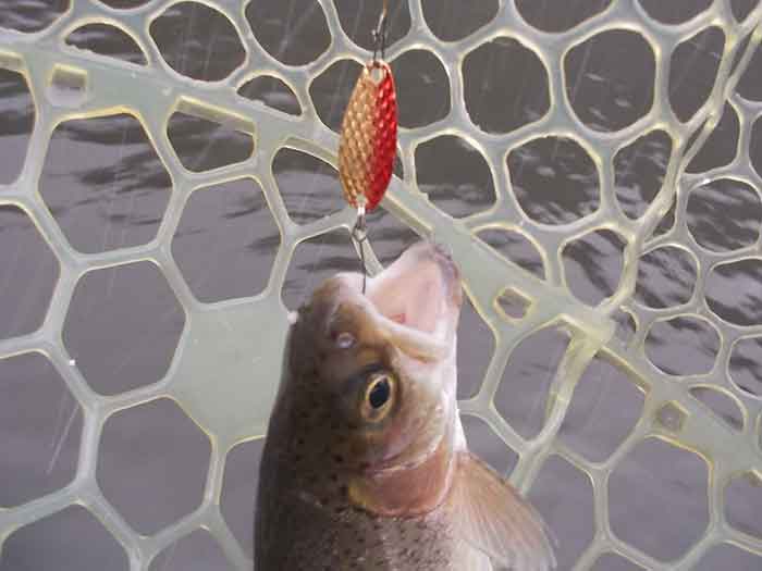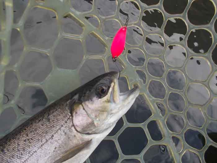 それからしばらくは1.1gスプーンを沈めて探っていたのですが、特に反応がなかったところで、午前中の放流が行われました。そこでタックルを放流用に替え、ルアーはドロップダイヤ1.8gスプーンのゴールドORを選択、表層のファストリーブで探って3匹の放流魚をキャッチ。その後も同じくドロップダイヤのアカキンにローテーションして2匹を追加。